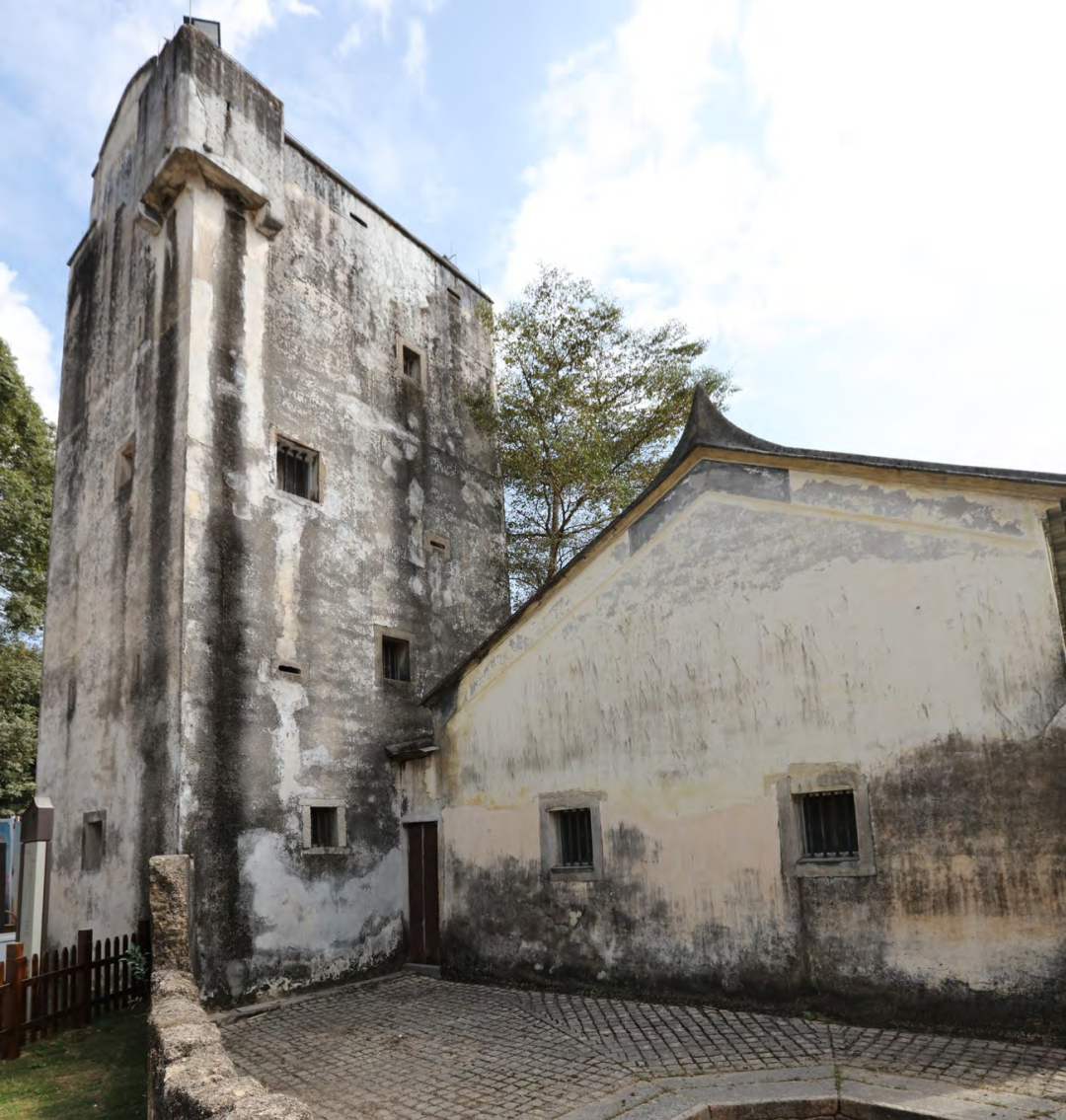 隔着大水田风水塘,对面两座高耸的炮楼在客家围屋建筑群里非常显眼,犹如卫士一样守护在聚落南北两端。这两座炮楼也称凌氏炮楼,是凌氏华侨所建,属于中西合璧式炮楼。