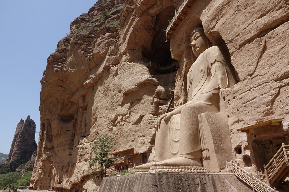 佛像左上方为169窟,169窟为一天然大洞穴,是现存最重要石窟,窟内存西秦时的造像和壁画。李仁奇 摄