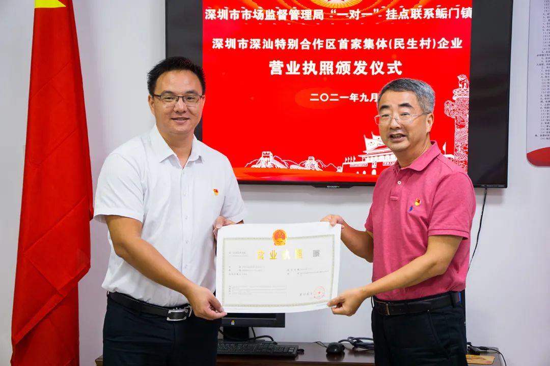 日前,深圳市深汕特别合作区(简称“深汕合作区”)在鲘门镇民生村颁发了首张集体性质村办企业的《营业执照》,标志该区集体性质村办企业登记工作进入新阶段。