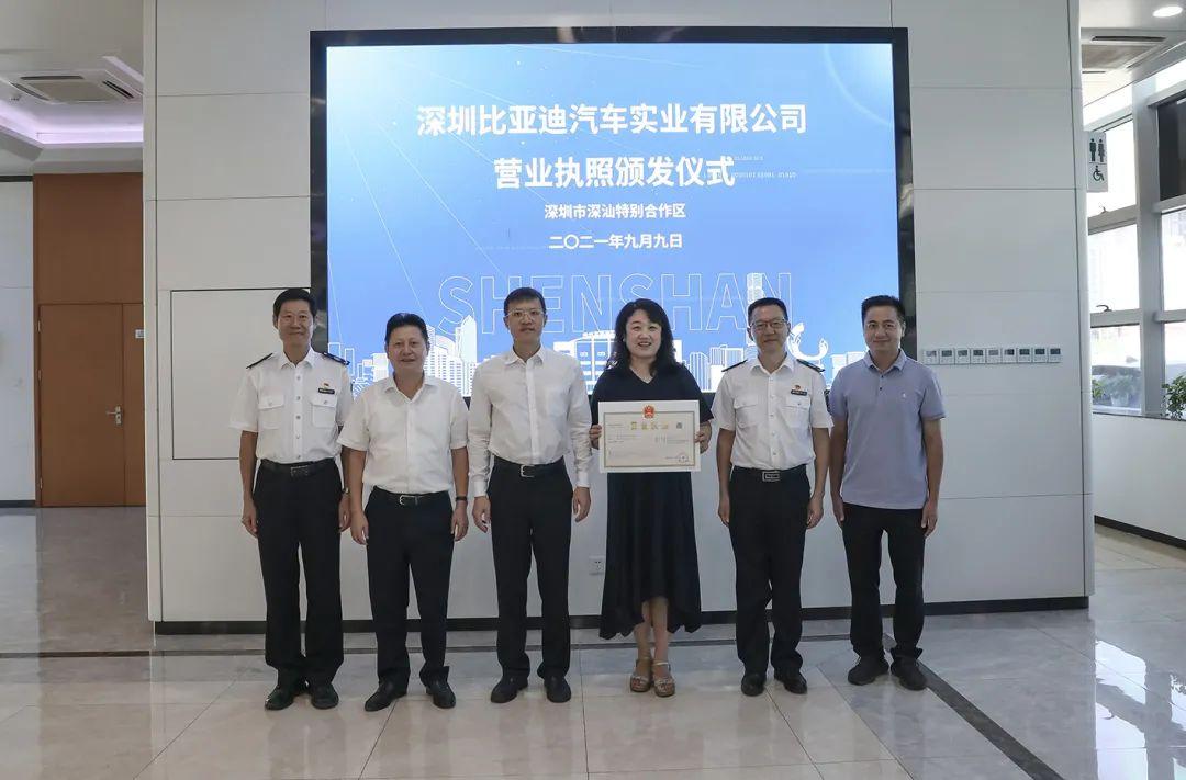9月9日上午,深圳比亚迪汽车实业有限公司的营业执照在深圳市深汕特别合作区(简称“深汕合作区”)颁出,标志着比亚迪汽车工业园(深汕)项目正式落地。这个一百亿级产值项目,将为深汕产业新城加速发展提供强大动力。