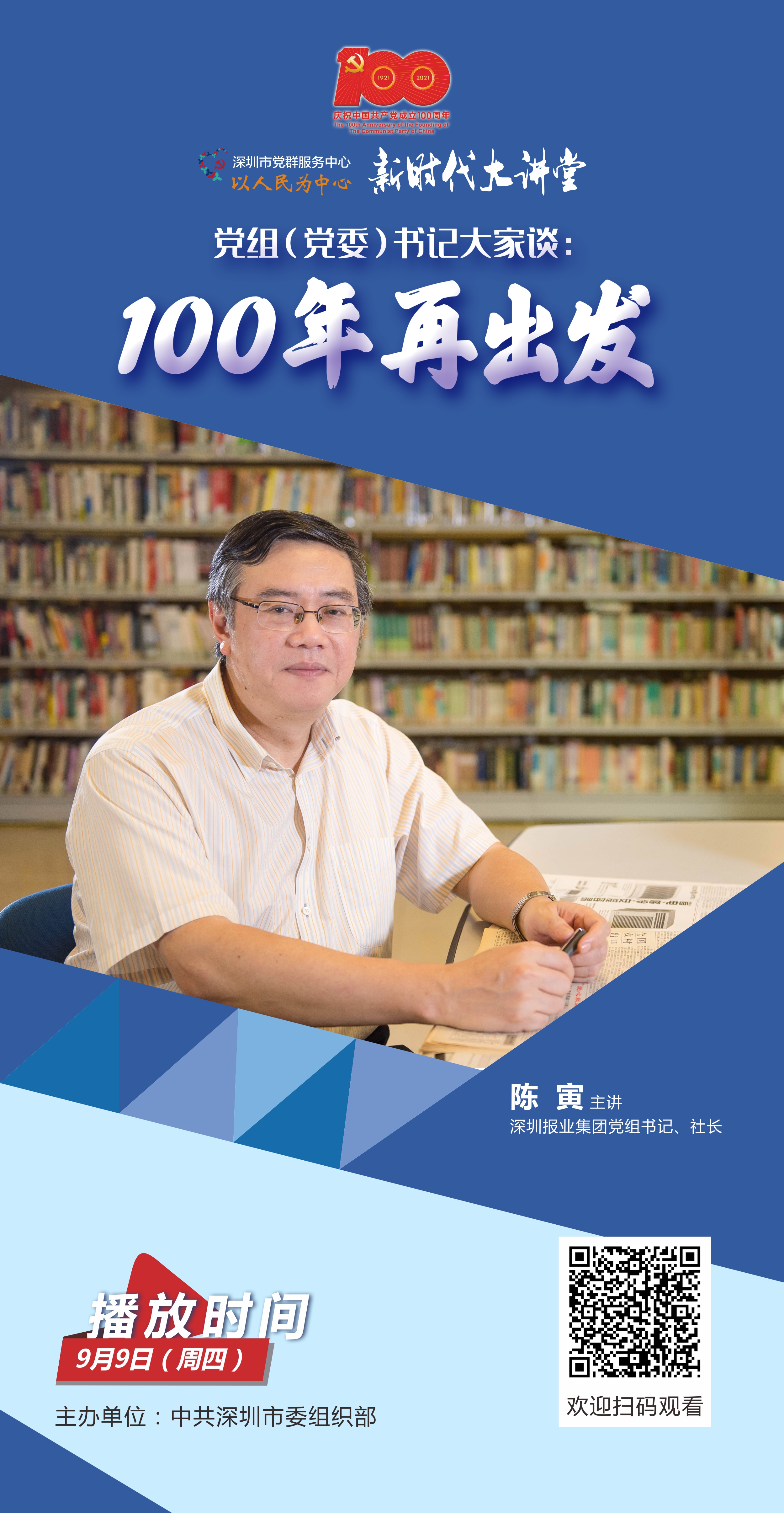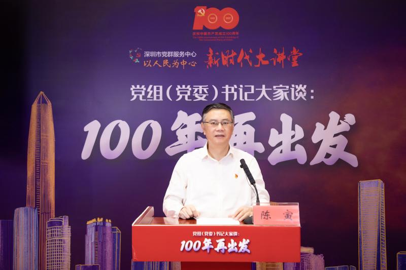 “党组(党委)书记大家谈:100年再出发”系列课程将每周四在市党群服务中心新时代大讲堂报告厅举行,邀请12个市直单位党组(党委)书记,结合学习宣传贯彻习近平总书记在庆祝中国共产党成立100周年大会上的重要讲话精神、“十四五”期间面临的形势挑战,讲述本单位本部门贯彻落实市第七次党代会精神的目标任务和工作思路。本期我们邀请到了深圳报业集团党组书记、社长陈寅,他的授课主题为《弘扬伟大建党精神,奋力建设与深圳城市地位相匹配的新型主流传媒集团》。