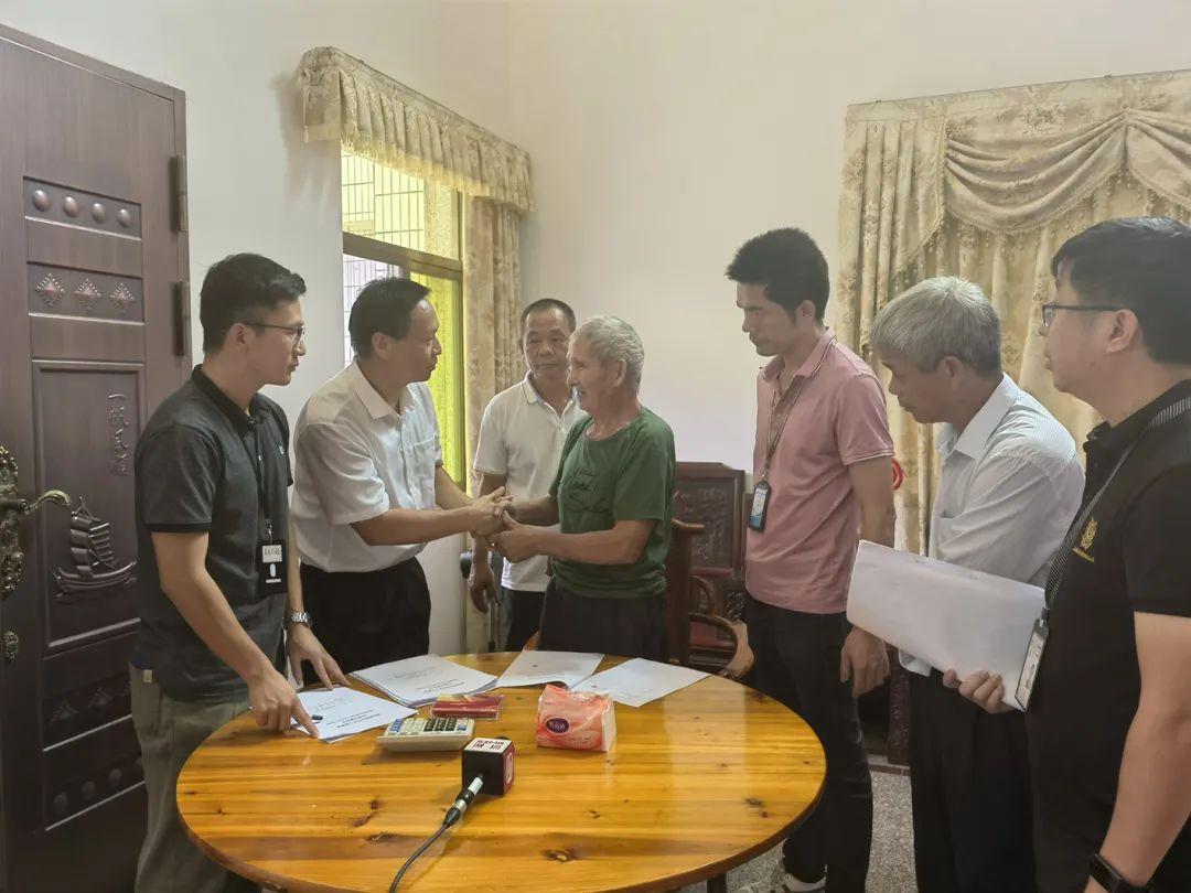 温贵户籍在西湖村委班鱼湖村,今年已81岁高龄,患高血压,是村里的“五保户”,目前在五华县龙村镇大梧村养病,平时由侄女照顾饮食起居。温贵的亲属原本打算把老人从五华县接到深汕合作区办理签约手续,但协商谈判十组考虑到老人年事已高,舟车劳顿不便,决定驱车前往其居所办理手续。区融媒体中心记者也跟随他们,记录了这场特别的签约仪式。