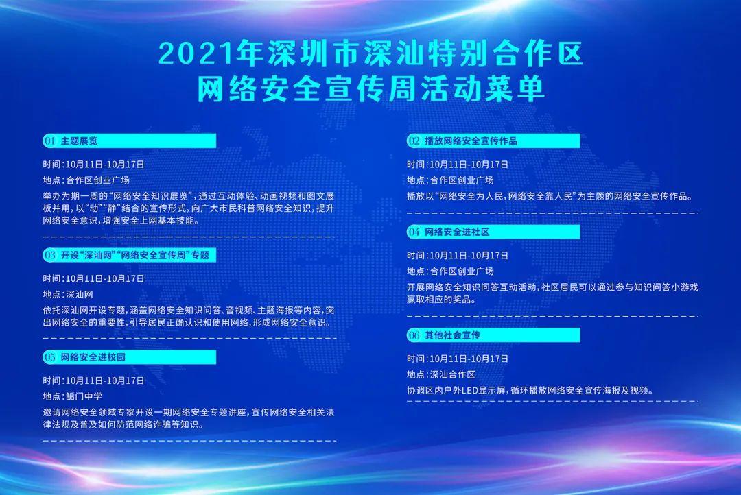 网络安全宣传周期间,深圳市深汕特别合作区(简称“深汕合作区”)将在创业广场等地,举行主题展览、网络安全进社区、网络安全进校园等六大线上线下主题活动,通过多种方式向广大市民科普网络安全知识,增强大家的网络安全意识,大力营造全社会共筑网络安全防线的良好氛围。