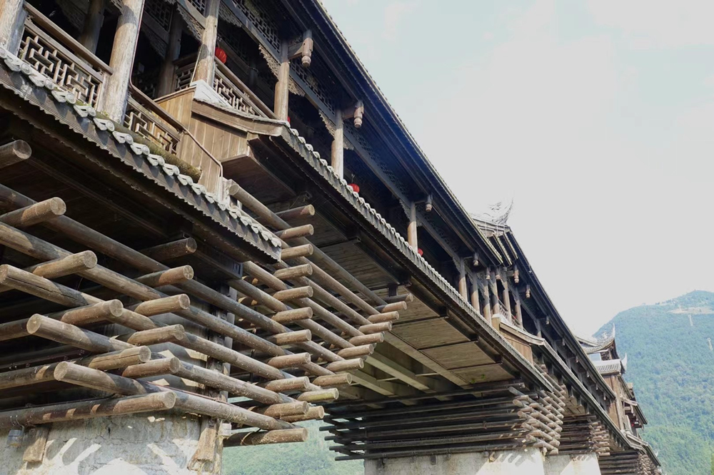 濯水廊桥长658米、宽5米,分为桥、塔、亭三部分,桥身为纯木结构,建筑材料之间以榫头卯眼互相穿插衔接,直套斜穿,牢固精密。李仁奇 摄
