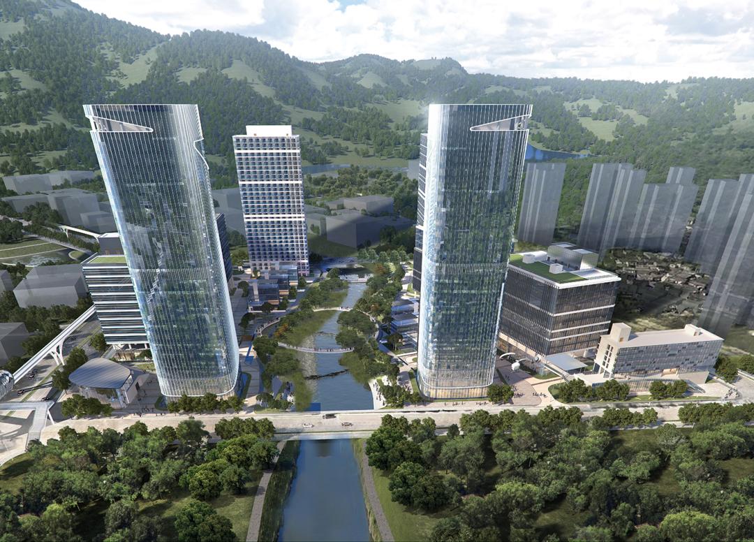 项目位于深汕湾科技城北侧,占地面积约6万平方米,包含超高层研发办公、研发厂房、高层宿舍、小型商业配套、生活服务配套及地下停车库等功能,绿化率达到30.2%,周边群山环抱,泗马岭河流淌其中,整体呈现出山水共生的和谐生态。
