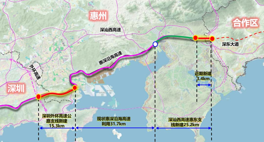 深圳外环高速公路支线:总投资约79.6亿元,路线全长约15.3公里,起点位于惠州市大亚湾区,接现状惠深沿海高速,向西穿越山体进入大亚湾西区,终点在深圳市坪山区接南坪快速路三期,目前正在开展勘察设计等前期工作。