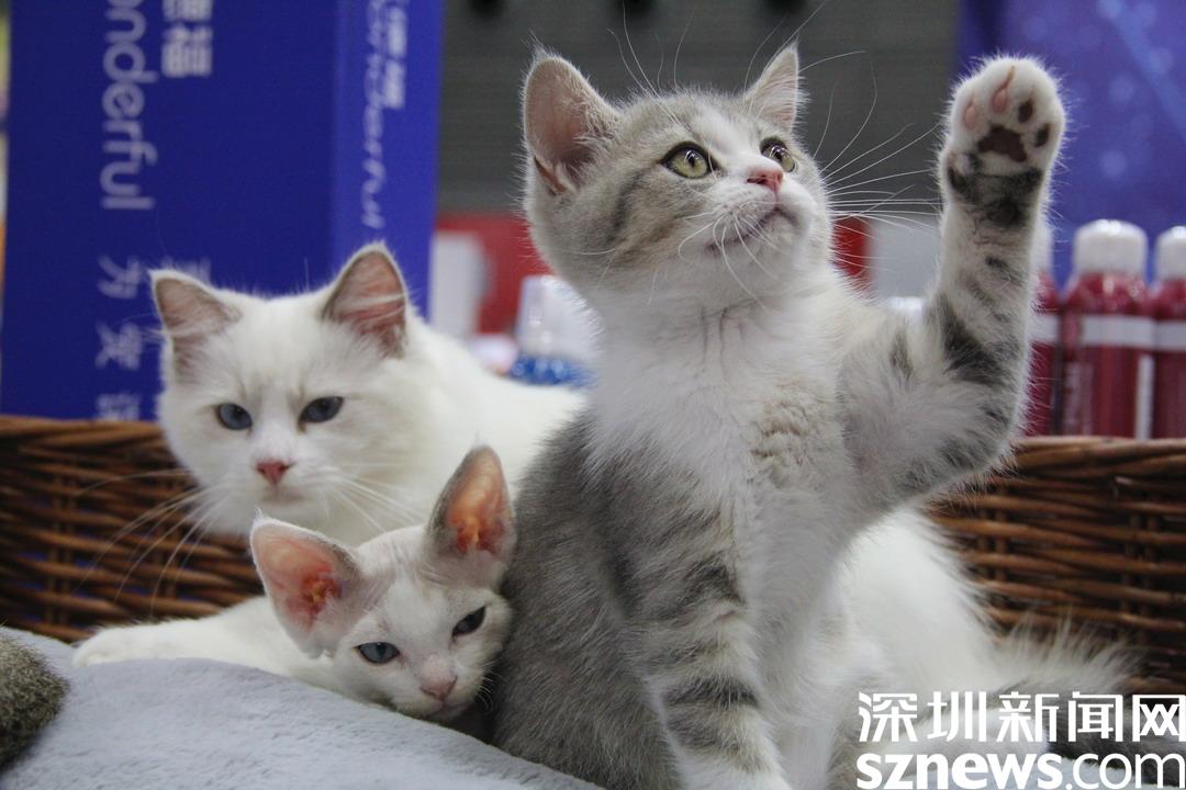参展商展示自家高颜值猫咪,猫咪与游客互动。