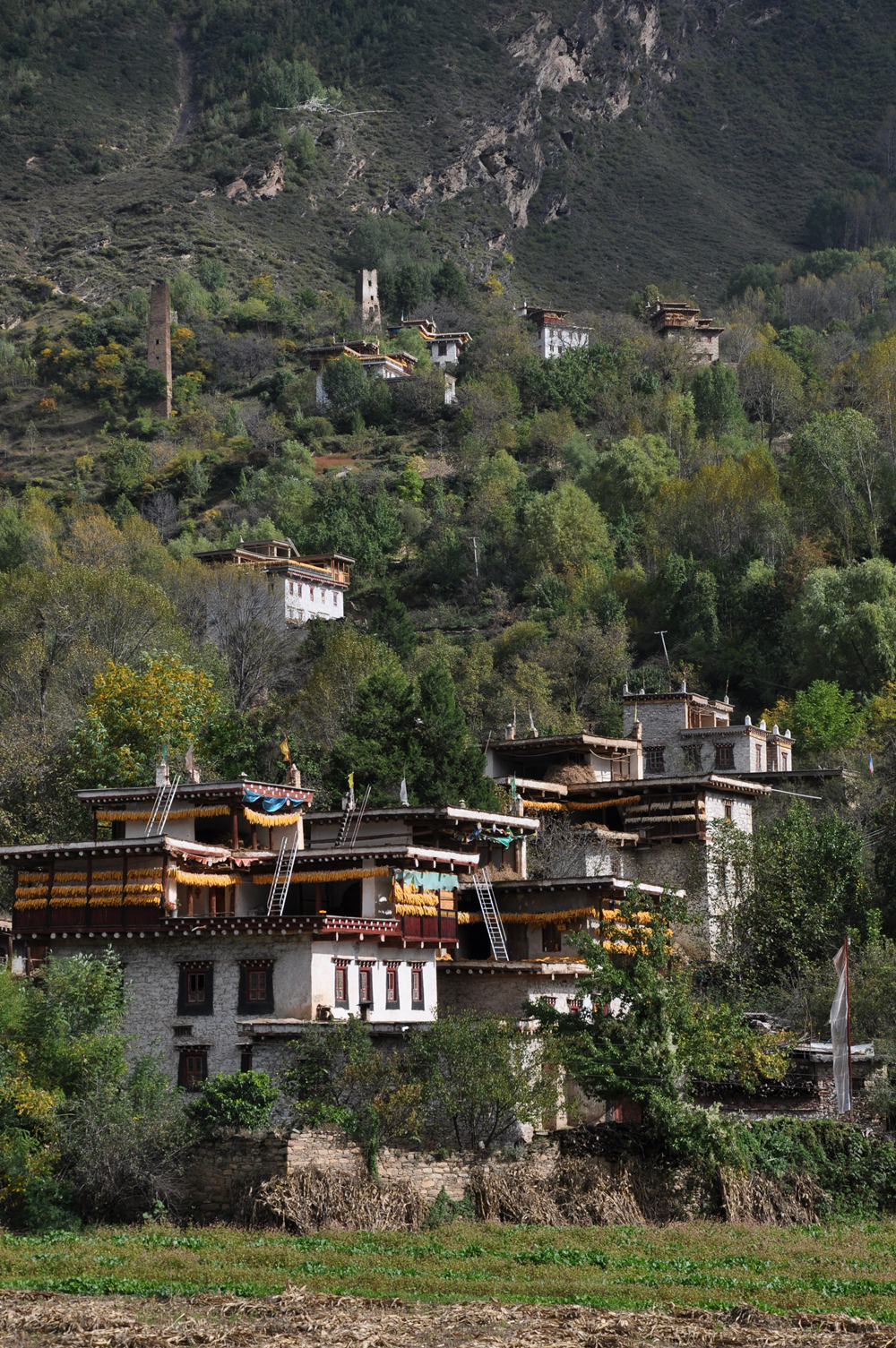 嘉绒藏民多居住在河谷或半山向阳的寨子里。自古以来,他们建就地取材建房,用黄泥作粘合剂,以石块砌墙,以巨木为梁,横搭杂木,盖土于上,坚固不漏。李仁奇 摄