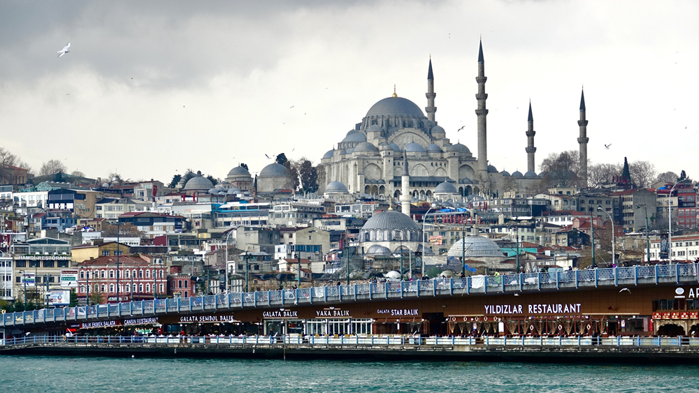 加拉塔大桥横跨金角湾,连接老城区和新城区,是众多轮渡的始发站和公交总站。桥上行车,桥下是餐馆,餐馆外是行人步道,中间是航道,很是奇特。李仁奇 摄