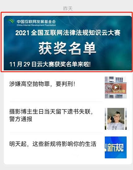 由国家网信办网络法治局指导、中国互联网发展基金会主办、法制网承办的“2021全国互联网法律法规知识云大赛”已于11月23日正式启动。本次竞赛活动历时一个月,网民可通过关注“法制网”微信公众号参与答题。