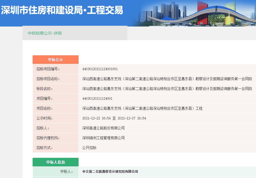 日前,深汕西高速公路惠东支线(深汕第二高速公路深汕特别合作区至惠东县)勘察设计及前期咨询服务第一合同段定标,中交第二公路勘察设计研究院有限公司在五位投标人中脱颖而出中标。