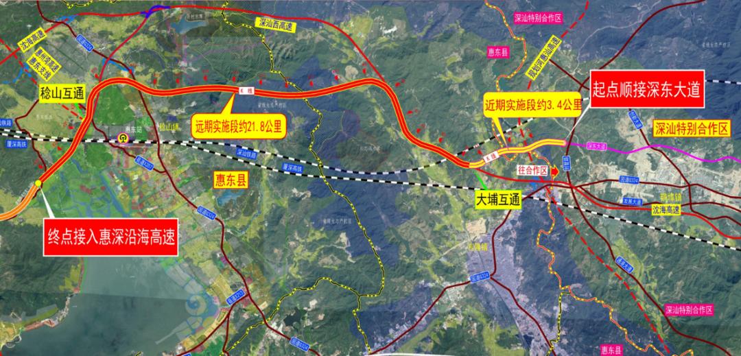 惠东支线项目分近远期实施,近期将实施深东大道至深汕西高速段约3.4公里,也是此次勘察设计定标的路段,包含深东大道部分路段改造、大浦互通立交北向西、西向北匝道及匝道范围内深汕西高速扩宽工程等,估算投资约11亿元。其中,涉深汕合作区段2.14公里。