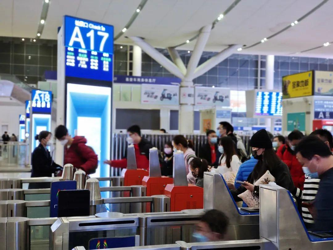 春运期间出行,要适当提早出门,为进站安检、实名制验证、验票留足时间,旅行途中,全程佩戴好口罩,保持“一米线”距离。