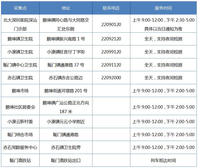 附表1:深汕特别合作区免费核酸采集点