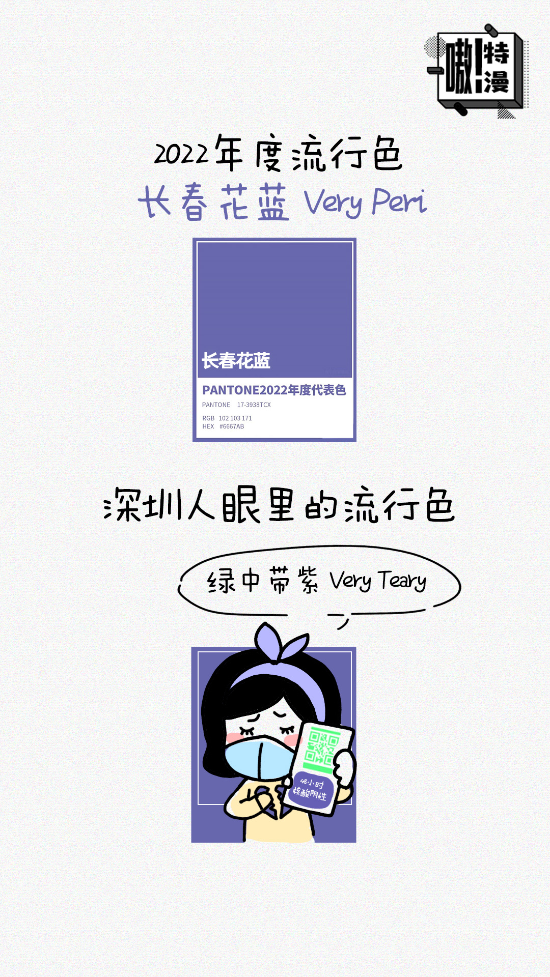 #嗷!特漫# 【#深圳人眼里的流行色是绿中带紫# 】潘通(一家专门开发和研究色彩的权威机构)发布的2022年度流行色是名为very peri的长春花蓝。而深圳人眼里的流行色则是绿中带紫 Very Teary