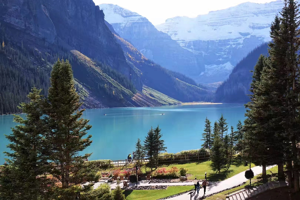 露易斯湖源自维多利亚冰川,湖水碧绿清澈,远望就像镶嵌在落基山脉中的一颗翡翠。李仁奇 摄