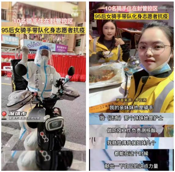 在福田上沙社区,还有一群特殊的骑手,她们是10名住在封控区的骑手。领骑的罗在燕是一名95后女骑士,受平台号召,她带着封管控区的骑手加入志愿者团队,给封闭区的居民配送物资。她还有两个妹妹,一个是同为志愿者的骑手,一个是护士。