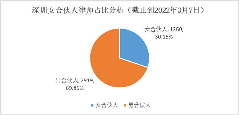 截至2022年3月7日,深圳律所共有注册合伙人律师4179人,其中女合伙人律师1260人,占总合伙人数的30.15%。