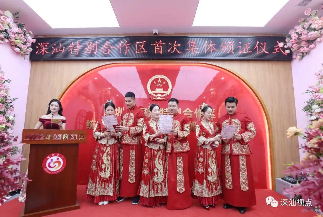 3月31日,市民群众期待已久的深汕特别合作区婚姻登记处正式揭牌,颁出了首批结婚证,写下深汕民生工作极具意义的一笔。揭幕后,登记处举办了简约而温馨的首次集体颁证仪式,为三对情定深汕的新人送上了一份“特别”难忘的祝福。