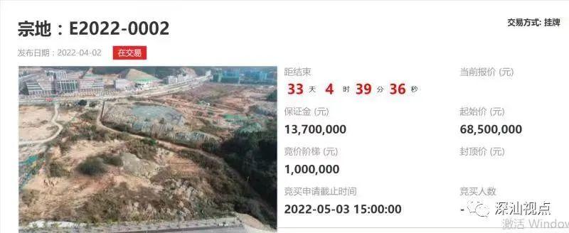 4月2日,深圳市规划和自然资源局深汕管理局委托深圳交易集团有限公司(深圳公共资源交易中心),以挂牌方式公开出让E2022-0001、E2022-0002两宗地的使用权,公告期自4月2日至4月21日,挂牌期自4月22日至5月5日15时止。