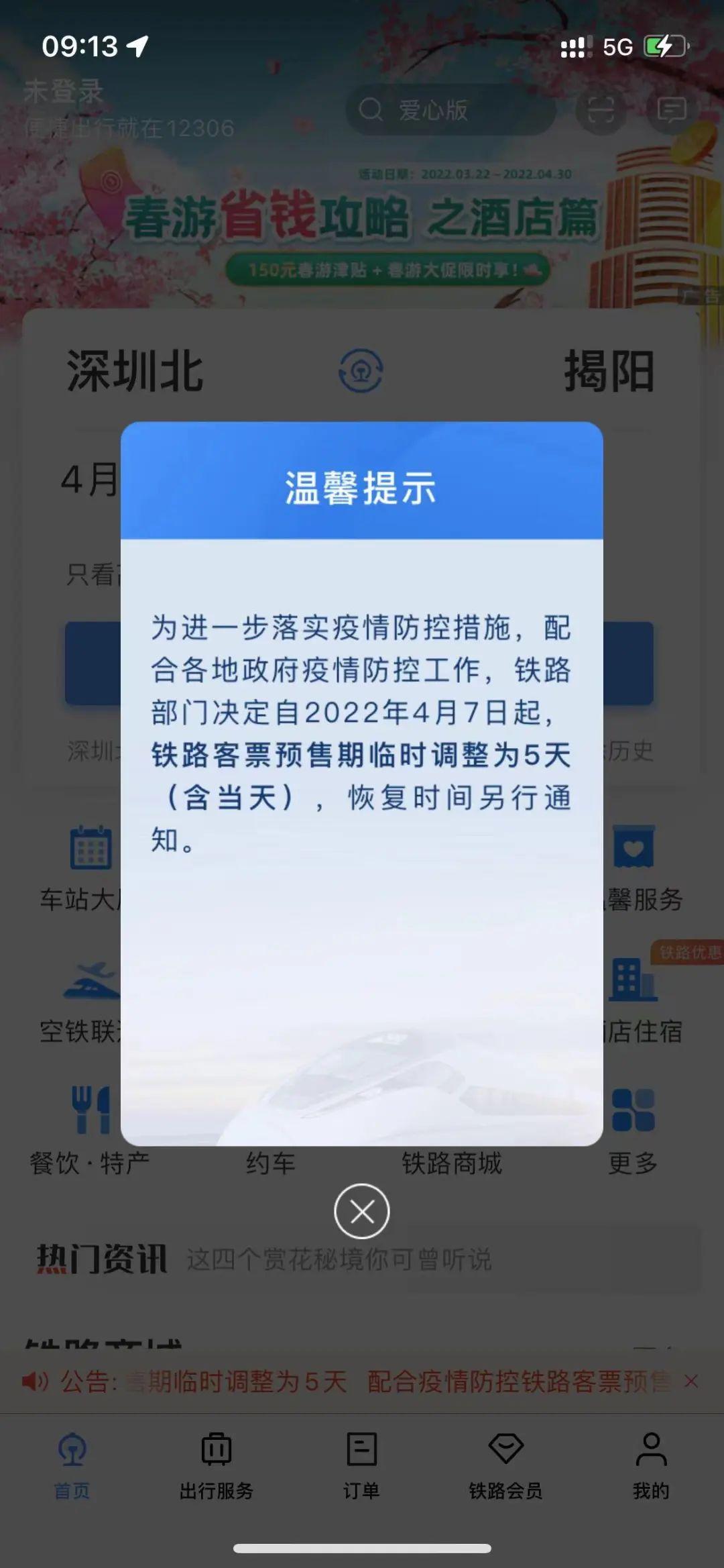 为进一步落实疫情防控措施,配合各地政府疫情防控工作,铁路部门决定自2022年4月7日起,铁路客票预售期临时调整为5天(含当天),恢复时间另行通知。