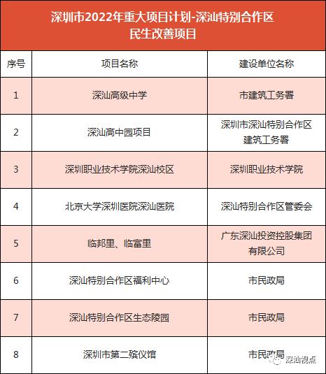 2022年市级重大项目中涉及深汕特别合作区民生改善项目8个,包括深圳中学高中园、深圳市第二高级中学深汕实验学校、深圳职业技术学院深汕校区、北京大学深圳医院深汕医院、临邦里、临富里等,总投资128.75亿元。