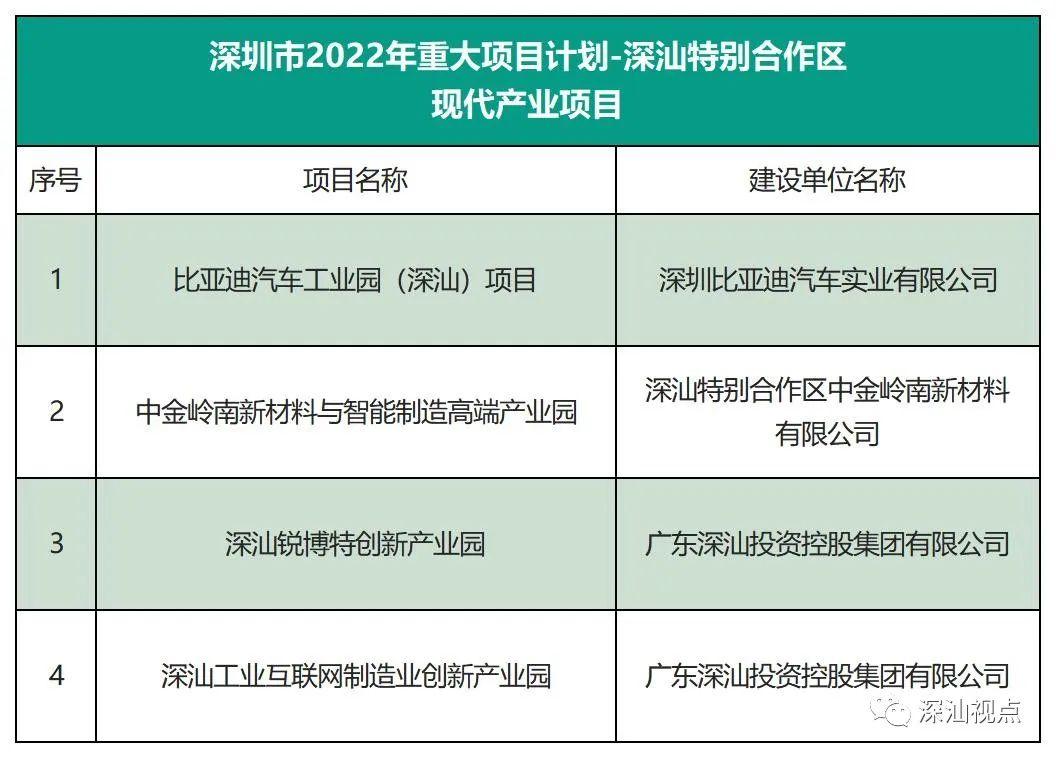2022年市级重大项目中涉及深汕特别合作区现代产业项目4个,包括深汕比亚迪汽车工业园一期项目、中金岭南新材料与智能制造高端产业园、深汕锐博特创新产业园、深汕工业互联网制造业创新产业园项目,总投资142.63亿元。