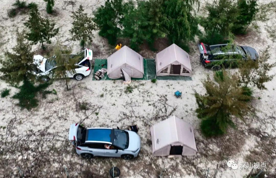临近傍晚,小编遇到了从深圳市南山区来的一对情侣,他们在阴凉处支起帐篷,随手捡起散落树枝在沙滩上“作画”,赤脚在沙滩上漫步。谢女士感叹:这处沙滩平缓舒展,沙质洁白细腻,又细又软,一点都不硌脚,像踩在了棉花上。在这里露营,非常棒。