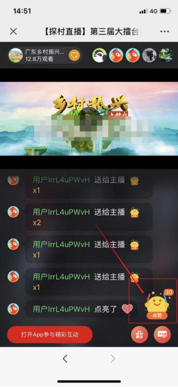 步骤4:在观看直播过程中,点击“点赞”按钮即可为本场直播点赞,每场直播每天(连续七天)每人可以点赞30次,点得多,抽得多!