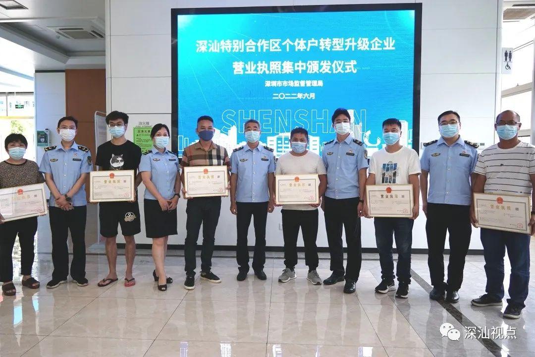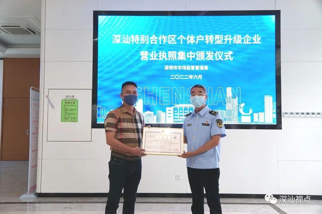 近日,深汕特别合作区首批个体户转型升级企业营业执照集中颁发仪式在区行政服务大厅举行。今年以来,为加快培育壮大市场主体,激发市场活力,深汕特别合作区积极推进“个转企”培育工作,引导个体工商户转型升级为企业,促进市场主体高质量发展。