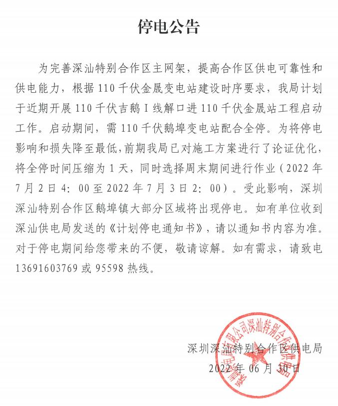 为完善深汕特别合作区主网架,提高深汕特别合作区供电可靠性和供电能力,根据110千伏金晟变电站建设时序要求,我局计划于近期开展110千伏吉鹅Ⅰ线解口进110千伏金晟站工程启动工作。启动期间,需110千伏鹅埠变电站配合全停。为将停电影响和损失降至最低,前期我局已对施工方案进行了论证优化,将全停时间压缩为1天,同时选择周末期间进行作业(2022年7月2日4:00至2022年7月3日2:00)。受此影响,深圳深汕特别合作区鹅埠镇大部分区域将出现停电。如有单位收到深汕供电局发送的《计划停电通知书》,请以通知书内容为准。对于停电期问给您带来的不便,敬请谅解。如有需求,请致电13691603769或95598热线。