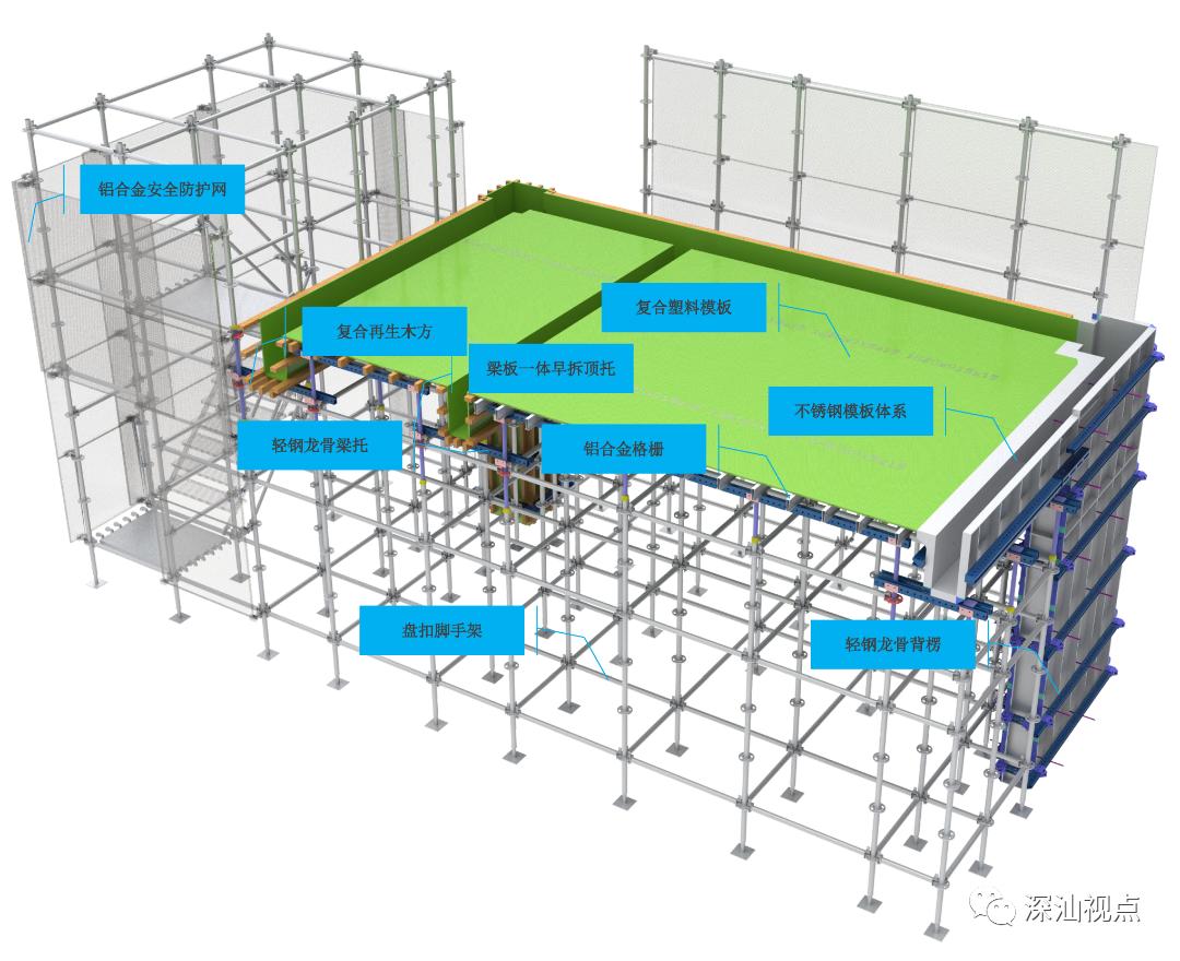 新型铝合金格栅:安装效率三倍于传统模架体系,大大提高模板周转率和施工效率,安全、低碳且便于管理。
