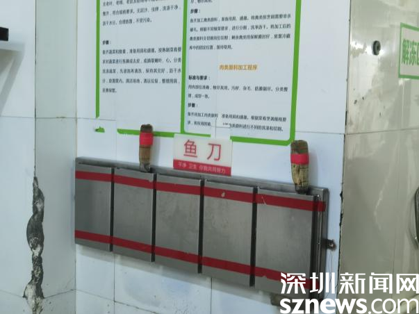 经检查发现,该餐厅后厨的菜类、肉类、水产品均有独立区域分开处理,刀具和砧板也按颜色区分,刀具还有专门的紫外线消毒柜,使用后及时消毒,保障卫生。