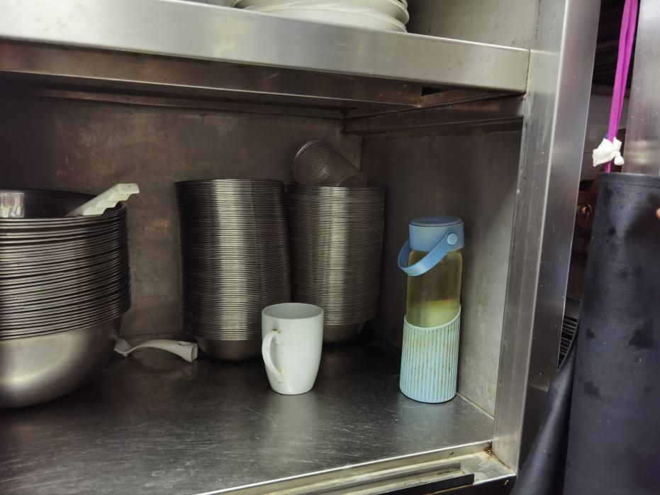 在该餐厅的洗消间,执法人员建议为消毒后的餐具添加门帘,避免餐具暴露在空气中,受到二次污染。在该餐厅的保洁柜中,存在员工个人物品与餐具混放的情况,不符合食品安全规定。