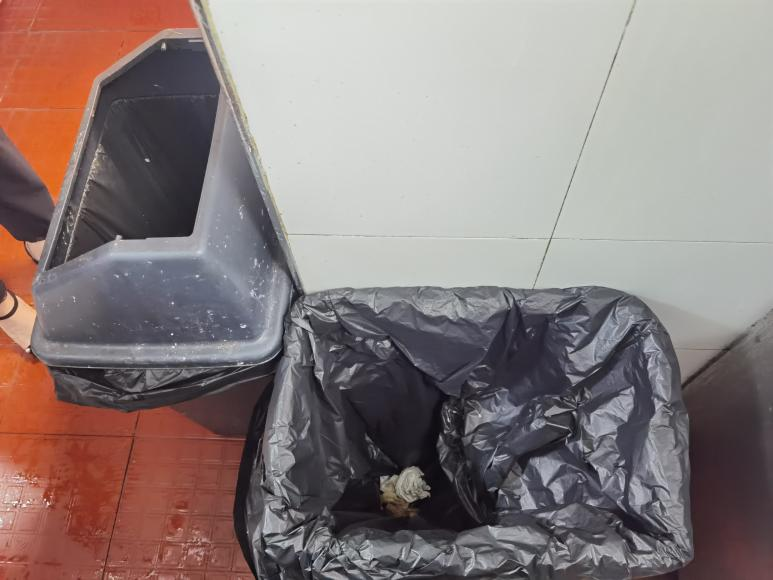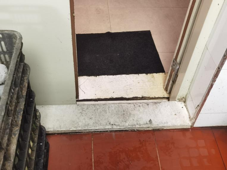 该餐厅后厨的门未添加挡鼠板,垃圾桶也缺少盖子,处于敞开状态。执法人员建议尽快整改,减少污染食材的可能。