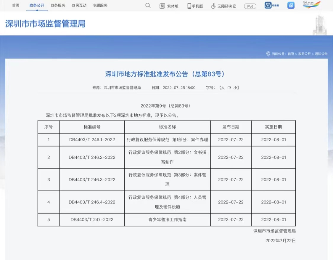 2022年7月22日,深圳市市场监督管理局发布《行政复议服务保障规范》。(深圳市司法局供图)