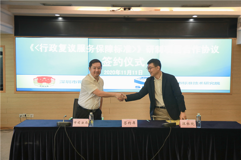 2020年11月11日,深圳市司法局行政复议处处长、一级调研员詹炳和深圳市标准技术研究院总监路宏峰共同签署了《<行政复议服务保障标准>研制项目合作协议》。(深圳市司法局供图)