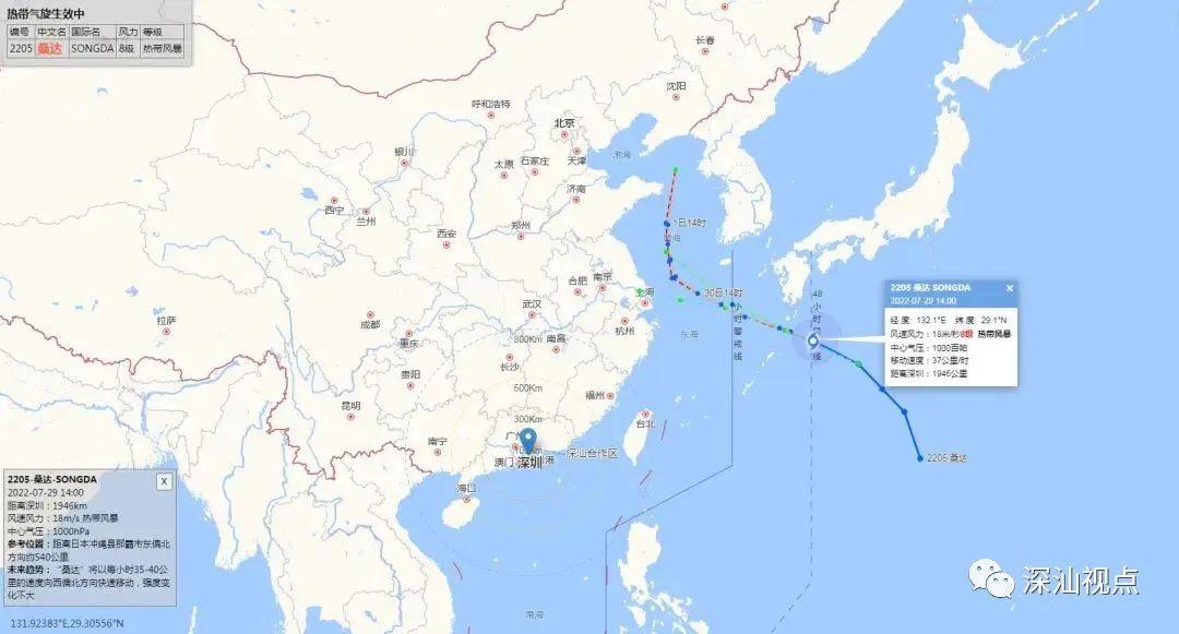 目前台风“桑达”(热带风暴级)位于深圳市偏东方1900公里,将趋向黄海海域,对深圳无直接风雨影响。