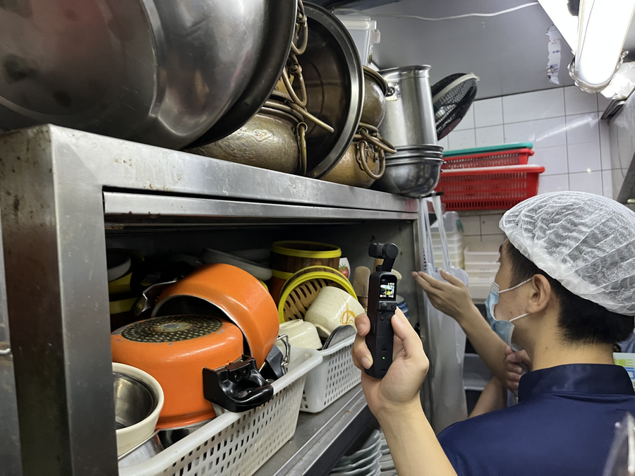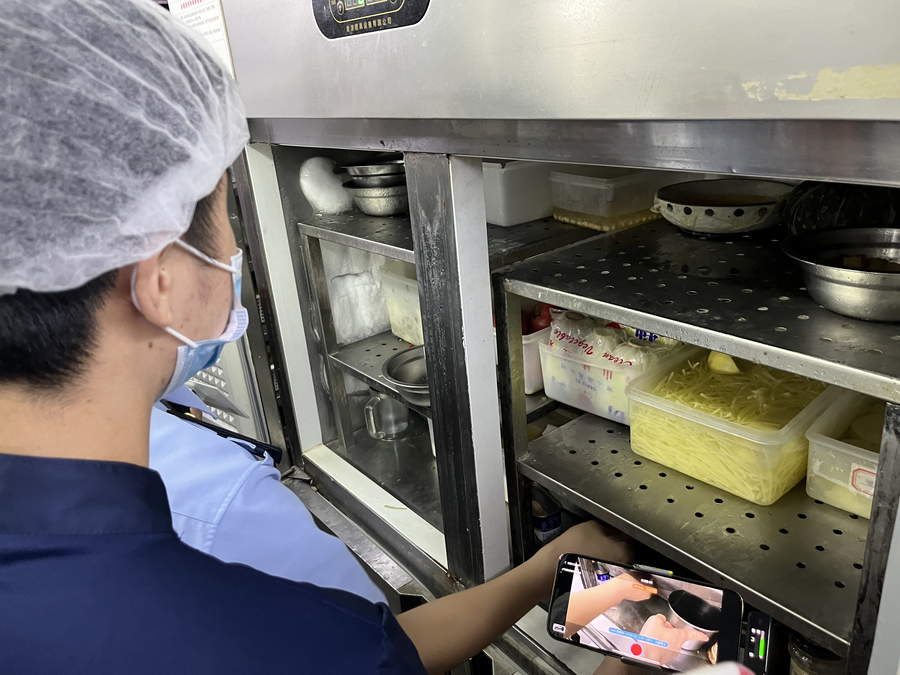 在餐厅后厨,记者看到地面积水积油导致湿滑,整体环境较为混乱。执法人员指出如下问题:一是垃圾桶未加盖;二是冰柜摆放杂乱,荤素混放,散装米粉无标签日期;三是保洁柜未启用,餐具表面有水渍,也未经消毒。此外,二楼仓库未安装通风设施,需尽快改进。