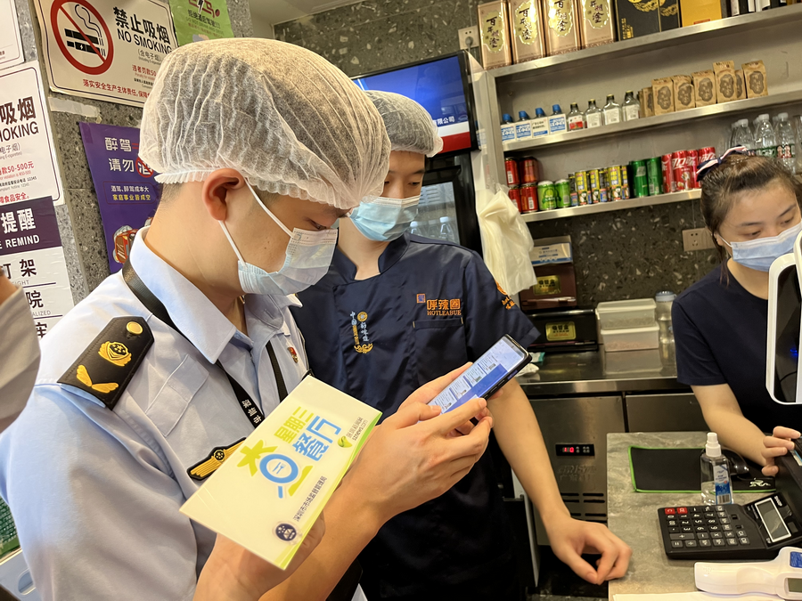 扫码登记后,执法人员一行进入该餐厅。在餐厅入口处的操作间内,悬挂了食品安全公示栏,目前该餐厅量化评级为C级。执法人员指出,公示栏应移到操作间外,张贴在显眼处。