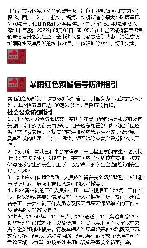 西部海区和宝安区(福永、西乡、沙井、航城、福海、新桥街道)最大小时雨量已达70毫米,预计强降雨还将持续1小时,仍有30-40毫米降水。深圳市气象台2022年08月04日16时05分在上述区域将暴雨橙色预警信号升级为红色。全市进入暴雨紧急防御状态,请注意防御强降水及其引发的城市内涝、山体滑坡等次生、衍生灾害。