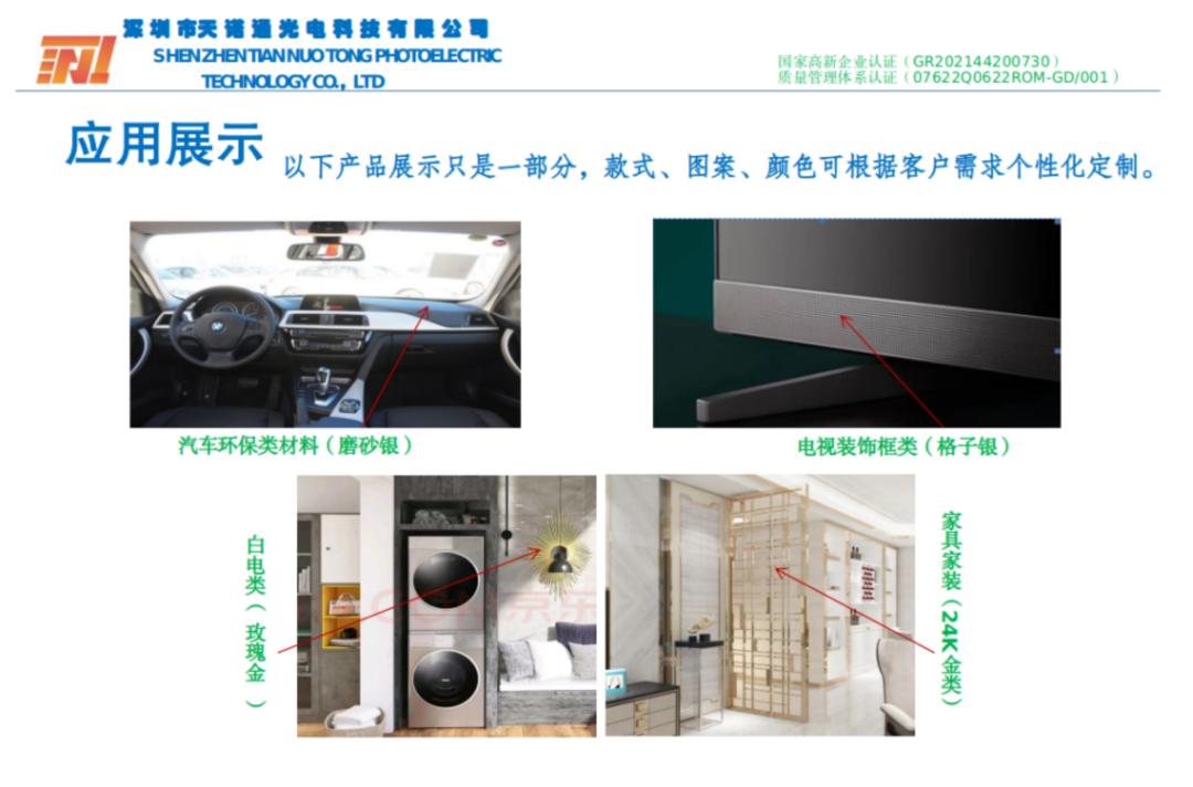 市场前景:可广泛应用在家电、汽车、家具家装等领域,替代需金属感的产品部件,可达到甚至超越其功能效果;