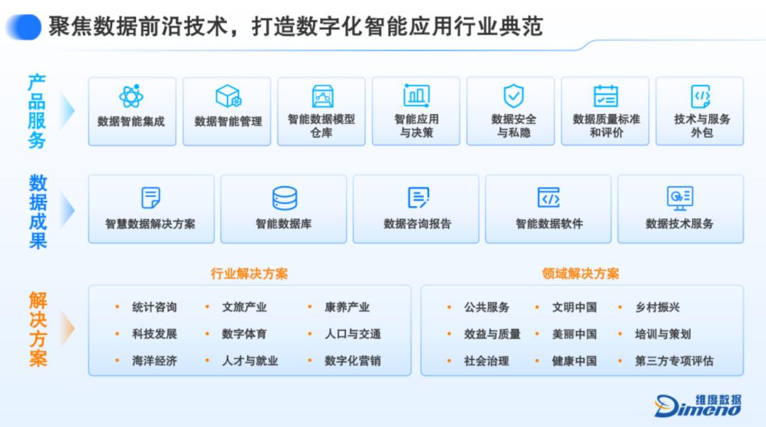 在行业智能应用的驱动下,依托强大的经验算法、平台使能和实施交付持续运营的能力,以社会经济数据要素为资源,面向各级政府及行业客户,为智慧统计、智慧经济、智慧产业、智慧园区、智慧治理、智慧城市等行业领域提供综合应用的产品图景和解决方案,致力于推动经济高质量发展和社会治理体系现代化建设。