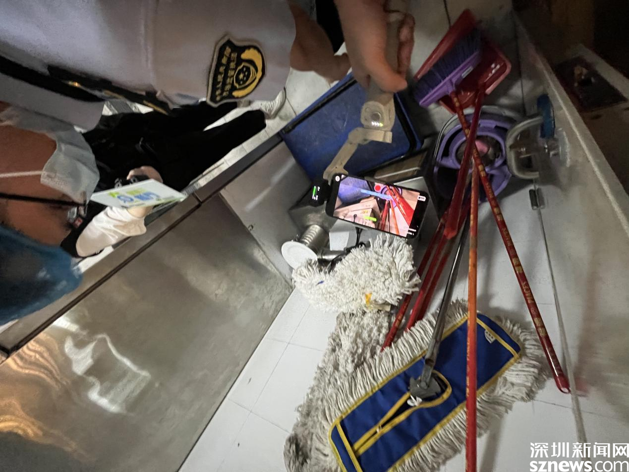 在其余区域的检查过程中,执法人员看到后厨清洁用具的摆放较随意杂乱,门后、冰柜旁均放置了拖把等工具。执法人员指出,即使不在餐品制作区域范围内,也应对清洁工具进行整理,保持后厨整洁。