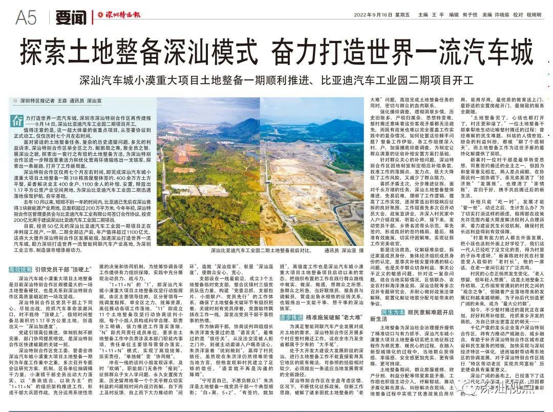 深汕特别合作区仅用七个月左右时间,即完成深汕汽车城小漠重大项目土地整备一期318栋房屋整体签约、400余万方土方平整,妥善解决业主400余户、1100余人的补偿、安置,释放连片平方公里级产业空间用地,为深汕比亚迪汽车工业园二期迅速落地保驾护航、夯牢基础。