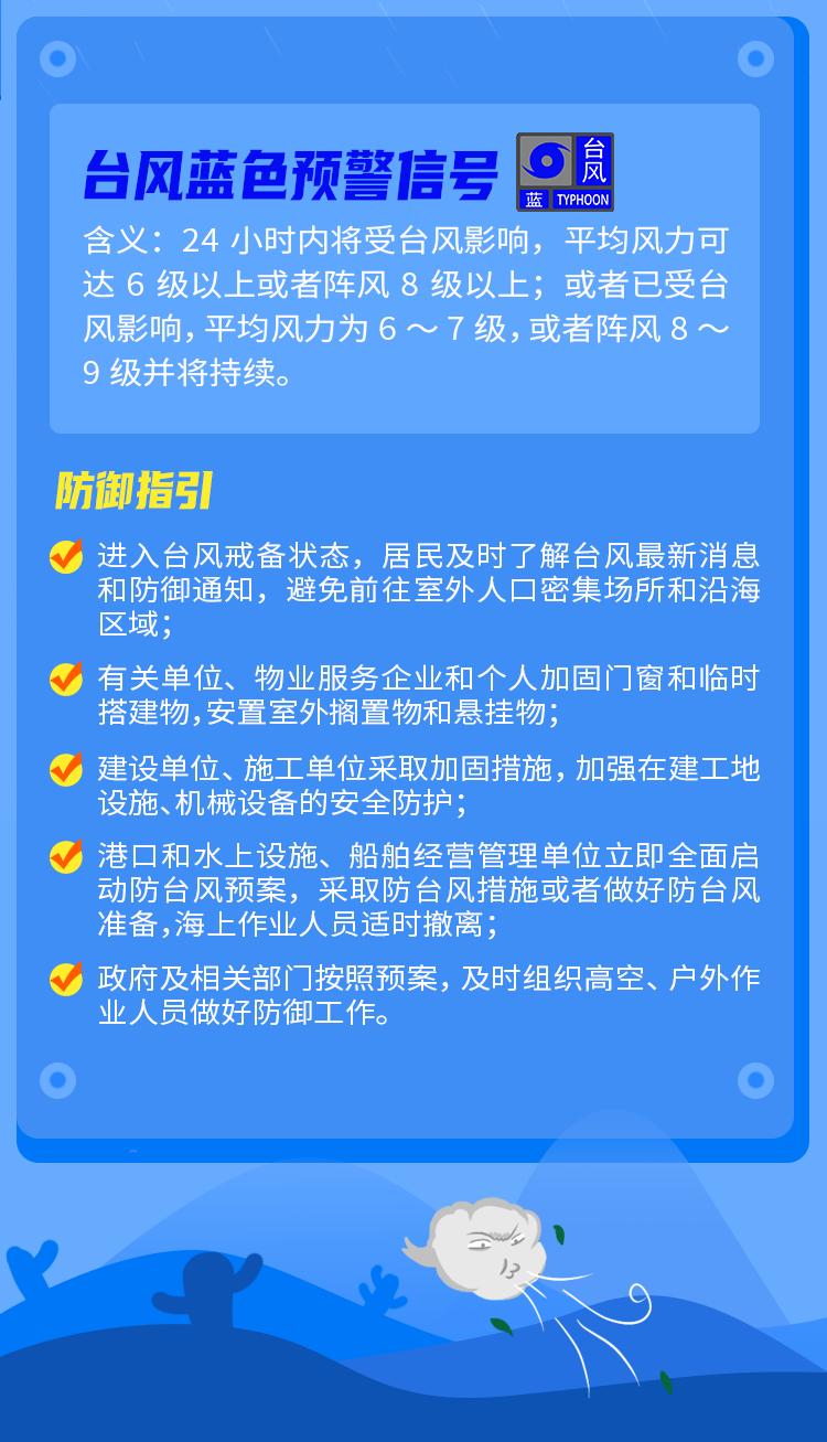 1、台风蓝色预警生效中,注意防范大风对港口码头、海上活动、户外疫情防控等造成的不利影响。