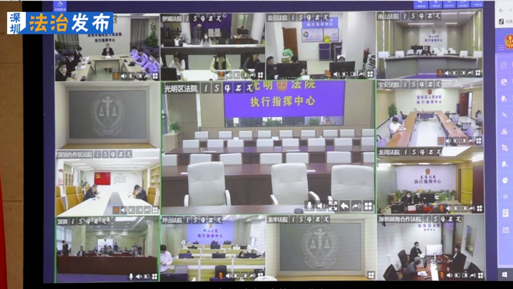深圳“10+1”区法院同步执行车辆查扣行动。图为深圳中院指挥中心连线大屏幕画面。(张宇杰 摄)