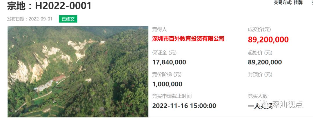 深圳市规划和自然资源局深汕管理局于10月20日委托深圳交易集团有限公司(深圳公共资源交易中心),以挂牌方式公开出让H2022-0001宗地的使用权。该宗地位于深汕特别合作区鲘门镇,位于鲘门高铁站西侧,土地面积约为11.74万平方米,建筑面积约为16.39万平方米,土地使用年限为30年,准入行业类别为教育,将规划建设一座72班寄宿制高中。