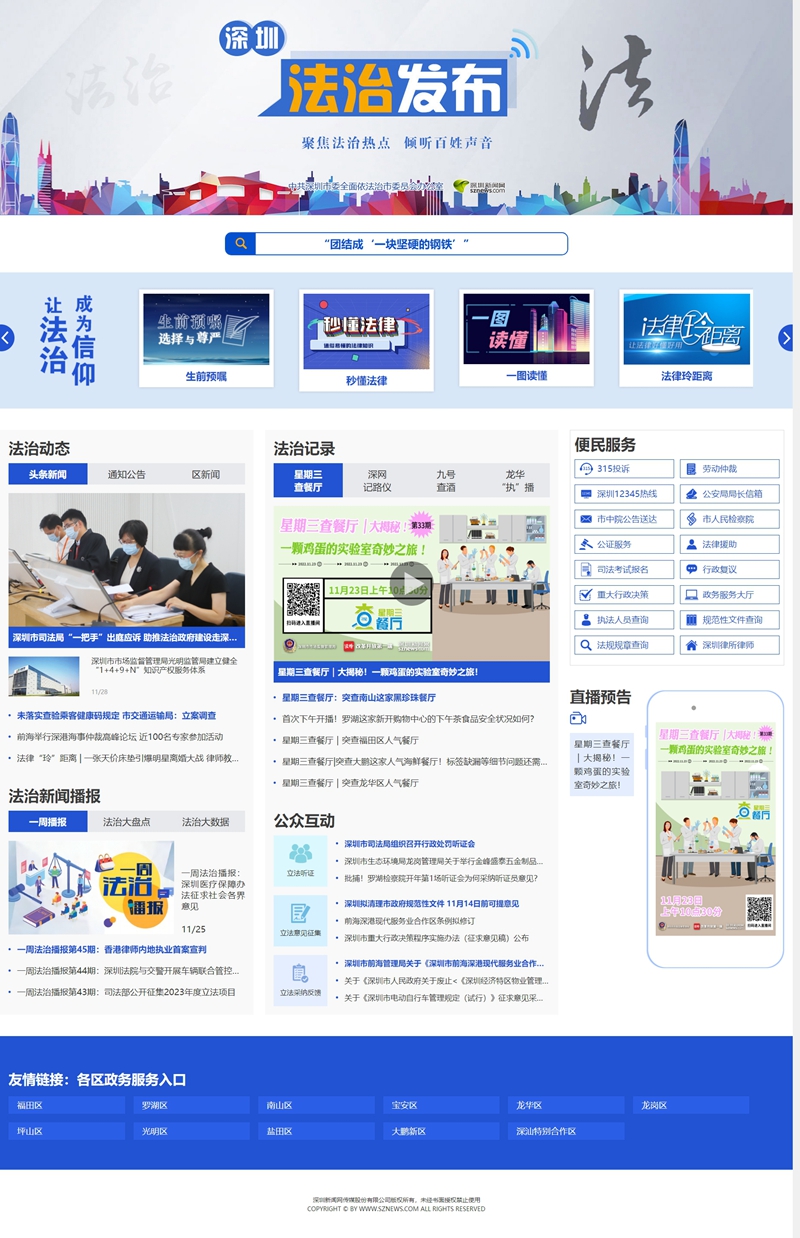 从2020年开始,深圳市委依法治市办联合深圳新闻网打造权威法治新闻发布平台和法治服务枢纽网站——深圳法治发布,为百姓法治需求提供一站式的公共法律服务。深圳作为法治先行示范城市,此前各类法治新闻和服务资讯散落在不同的部门,缺少一个权威的法治新闻枢纽可一键直达。该平台汇聚了全市乃至全国最新法治热点以及百姓法治需求,是深圳法治建设一大创新举措。