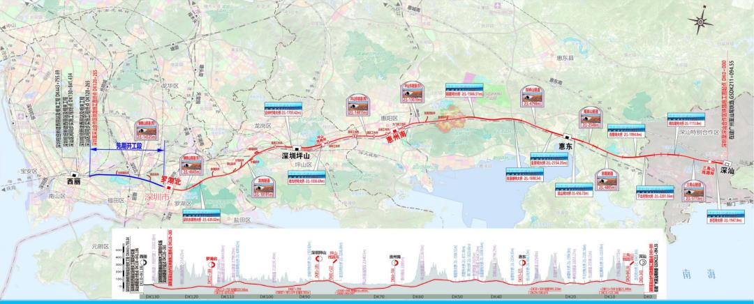 设计时速为350公里,正线全长125.520公里。其中,深圳市区段52.541公里,惠州段56.065公里,深汕特别合作区段16.914公里。全线设西丽(不含)、罗湖北、深圳坪山、惠州南、惠东、深汕共6座车站。建设总工期5年。